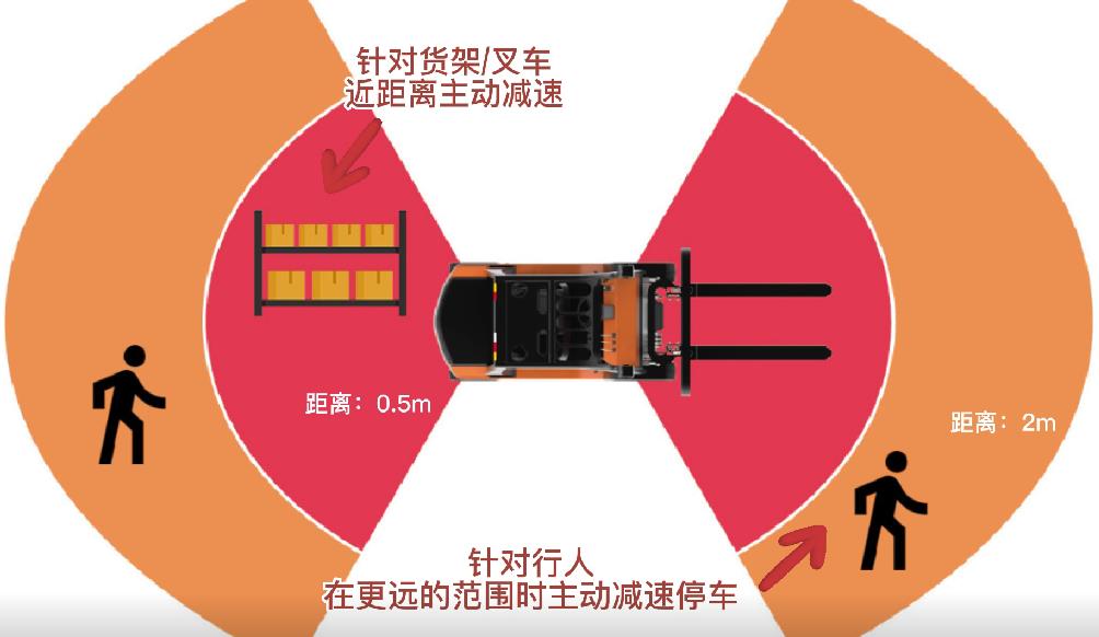 全新的TEKNECT智能防撞系统能够区分行人和一般物体,采取不同安全管控措施。针对行人在更远的范围时主动减速停车,而针对一般物体,那么就要在更近的距离时,主动减速。考虑到狭窄空间作业,一般物体出现,只减速而不停车。从而实现安全和效率平衡。