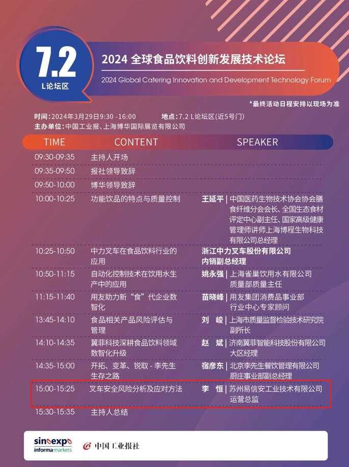 我们很荣幸受到中国工业报社&上海博华国际展览有限公司主办方的邀请,苏州易信安工业技术有限公司运营总监李恒于3月29日受邀参加了“食”不我待,智造技术助推餐饮加工高质量发展”论坛,并发表了主题演讲。旨在分享有关叉车安全风险分析及应对策略的见解。